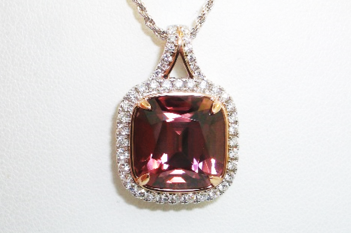 Ladies 14k two toned rose and white gold pendant set with (1) one 11.7 x 11.4mm rectangular cushion cut spice zircon that weighs 11.26 carats and (44) forty-four round brilliant cut diamonds that weigh a total of .55 carats. Complete with a 14k white gold 1.2mm rope chain that measure 18 inches in length.