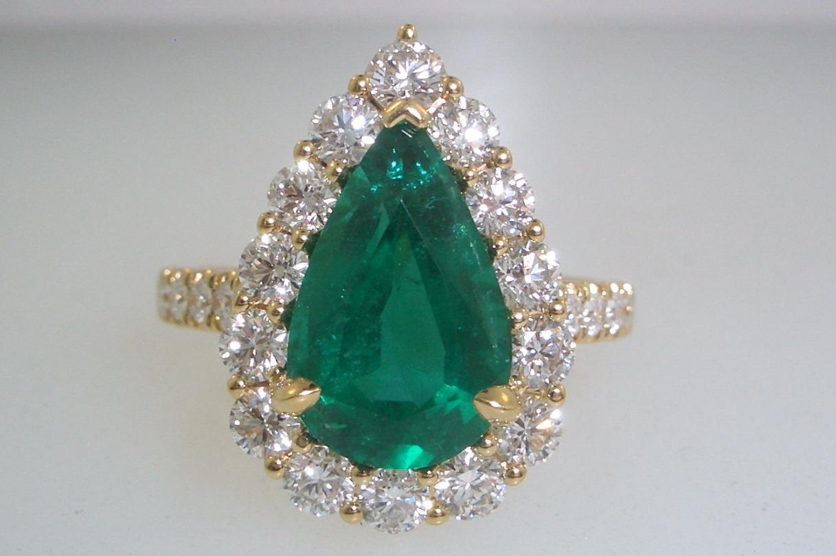 Ladies 18k yellow gold statement cocktail ring set with (1) one natural pear-shaped emerald that weighs a total of 3.22 carats and (24) twenty-four round brilliant cut diamonds that weigh a total of 1.38 carats. Gold weight with gemstones is 7.03 grams.