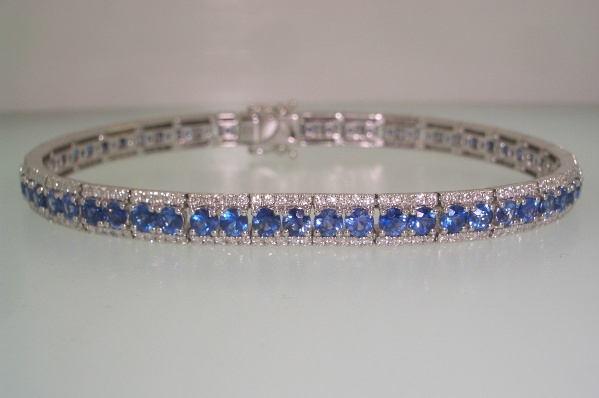 18k white gold bracelet set with (60) sixty round cut blue sapphires that weigh a total of 6.22 carats and (302) three-hundred and two round brilliant cut diamonds that weigh a total of 1.46 carats.