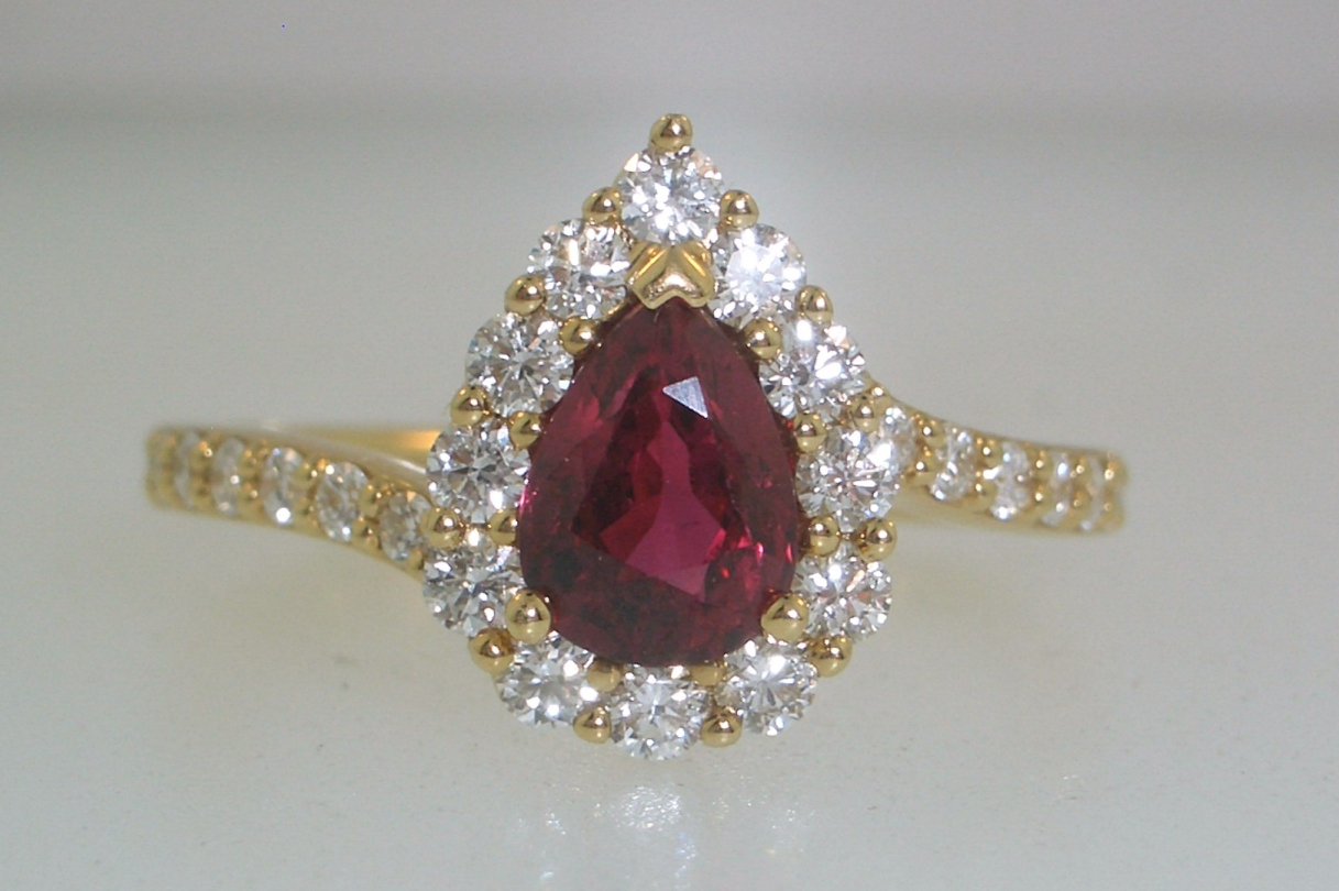 Ladies 18k yellow gold ring set with (1) one pear shaped ruby that weighs 1.02 carats and (24) twenty-four round brilliant cut diamonds that weigh a total of .52 carats. Gold weight with gemstones is 4.38 grams.