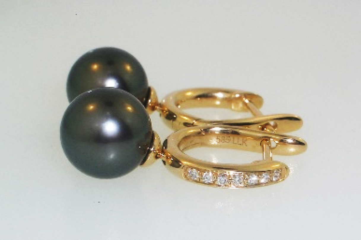 Ladies 14k yellow gold drop style earrings set with (2) two 8-8.5mm grey color Tahitian pearls. Also set with (14) fourteen round brilliant cut diamonds that weigh a total of .081 carats.