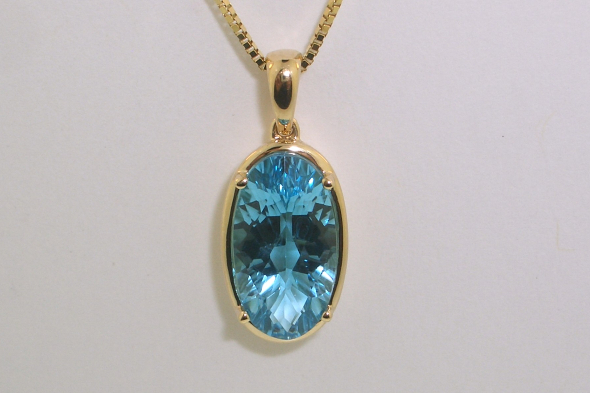 Ladies 14k yellow gold pendant set with (1) one 13x7mm concave oval cut blue topaz with checkerboard faceting that weighs a total of 3.50 carats. Complete with a 14k yellow gold .70mm box chain that measures 18 inches in length. Gold weight with chain and gemstone is 4.13 grams. Chain only $570.00 (QG #BOX075-18, 10-3H6F-26).