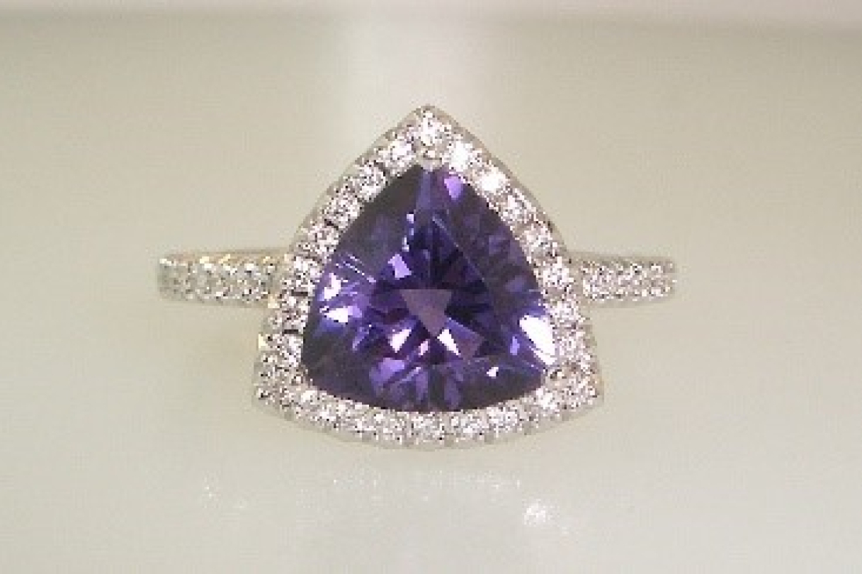 14k white gold ring set with (40) forty round brilliant cut diamonds in a halo style weighing a total of .20ct. and one trillion cut amethyst gemstone weighing 1.54 carats.