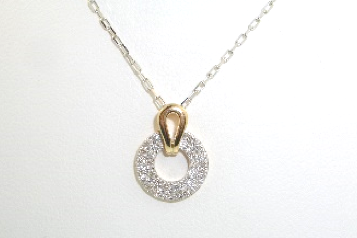 Ladies 14k two tone white and yellow gold disc style pendant set with (30) thirty round brilliant cut diamonds weighing a total of .20ct.. Complete with an 18” 14k white gold paperclip style chain.