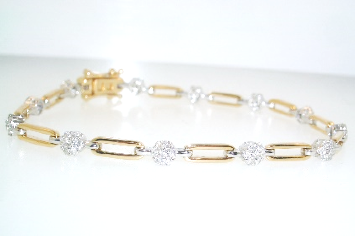 Ladies 14k two toned white and yellow gold bracelet set with (84) eighty-four round brilliant cut diamonds that weigh a total of .93 carats.