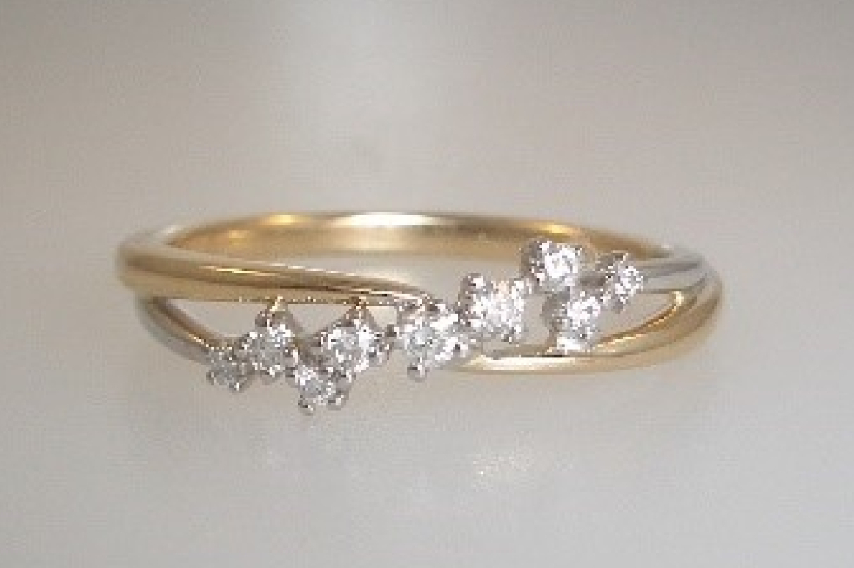 Ladies 14k two-tone gold and diamond crossover inspired wedding band. The band is set with (9) nine round brilliant cut diamonds that weigh a combined total of .10ct..