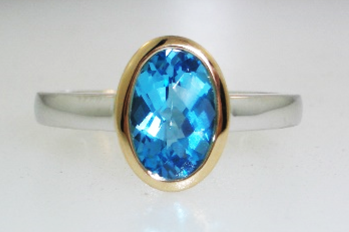 Ladies 14k two tone fashion ring bezel set in yellow gold with (1) one oval shape London blue topaz that weighs 1.93 carats. The ring is complete with a white gold band.
