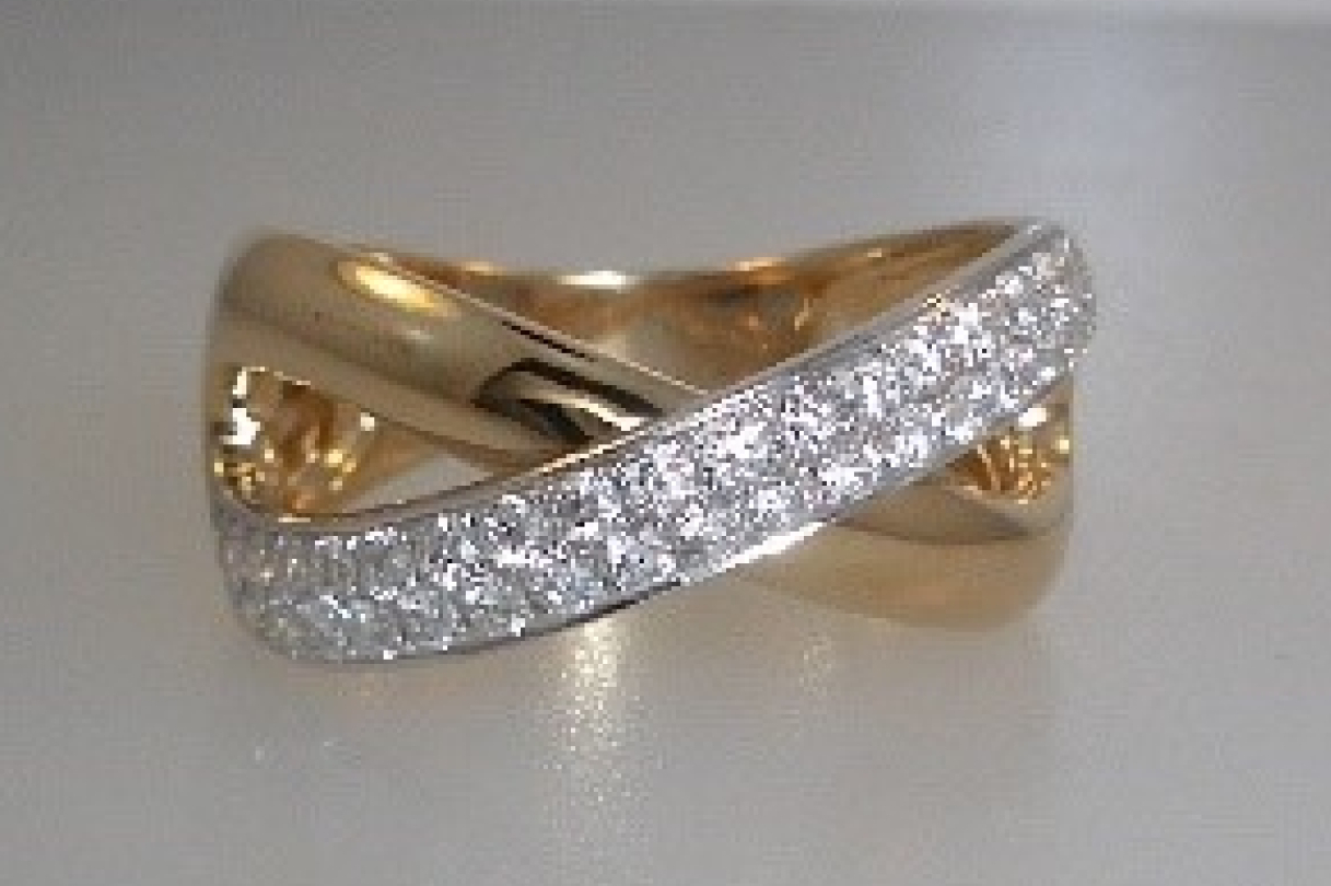 Ladies 14k two tone yellow and white gold bypass style diamond ring, set with (40) forty round brilliant cut diamonds that weigh a total of .56ct..