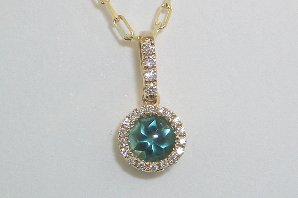 Ladies 14k yellow gold pendant set with (1) one 4.5mm round green tourmaline with a buff top and faceted pavilion that weighs .43 carats with a diamond halo and bail that is set with .08 carats of round brilliant cut diamonds. Complete with a 14k yellow gold paperclip style chain that measures 18” in length. Gold weight with chain and gemstones is 2.67 grams.