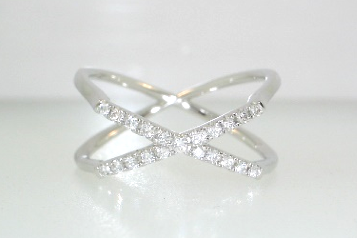 Ladies 14k white gold “X” fashion ring set with (21) twenty-one round brilliant cut diamonds weighing .17 carats.