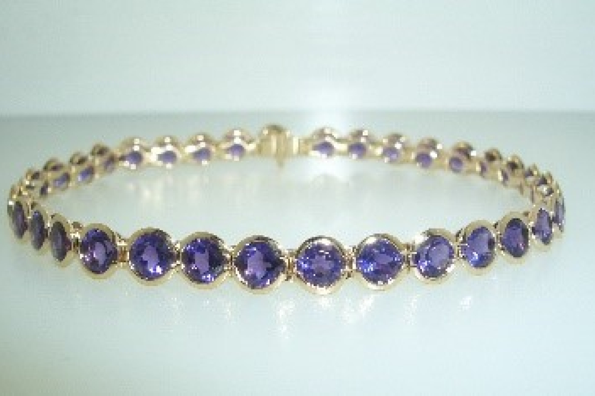 14k yellow gold amethyst bracelet measuring 7 inches in length. The bracelet is bezel set with (35) thirty-five 4mm each round faceted amethyst gemstones of AAA quality weighing a total of 8.40 carats.