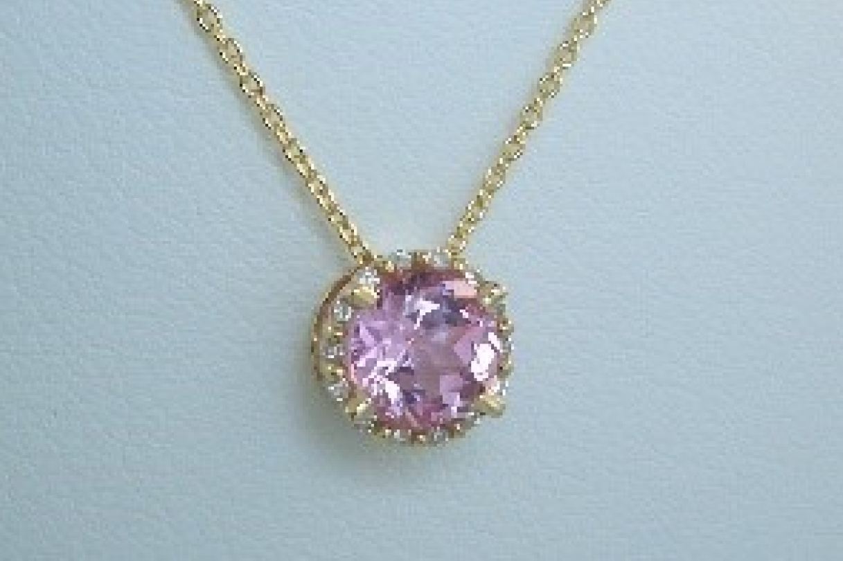 Ladies 14k yellow gold and created pink sapphire pendant. The pendant is set with (1) one lab created pink sapphire that weighs .67ct., and (14) fourteen round brilliant cut diamonds that weigh a total of .04ct.. The pendant is complete with a 14k yellow gold cable link chain, measuring 18” in length. Chain included.