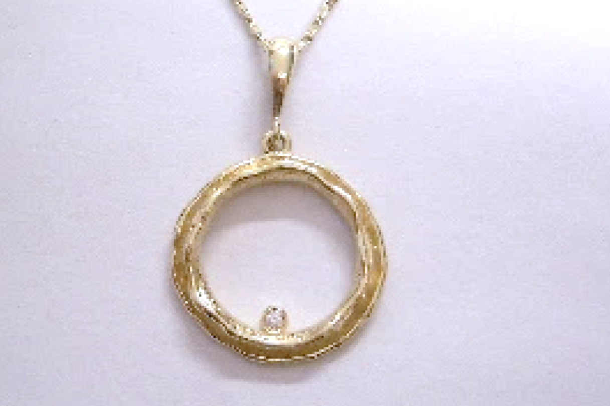 Ladies 14k yellow gold and diamond circle pendant with handmade textures. The pendant is set with (1) one round brilliant cut diamond that weighs .03ct.. The pendant is complete with a 14k yellow gold raso style chain, measuring 18 inches in length.