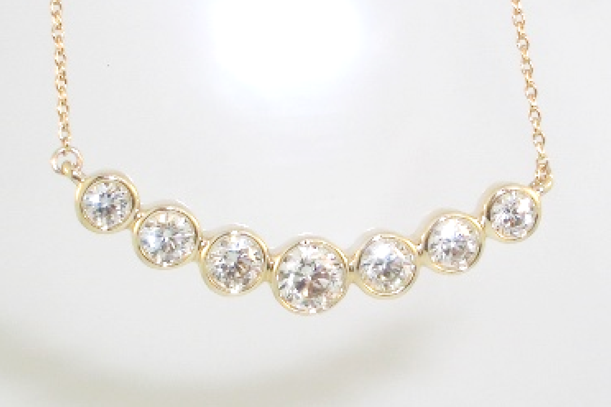 Ladies 14k yellow gold smile necklace bezel set with (7) seven round brilliant cut diamonds that weigh a total of 1ct. . Complete with a yellow gold adjustable cable chain that measures 20 inches in length.