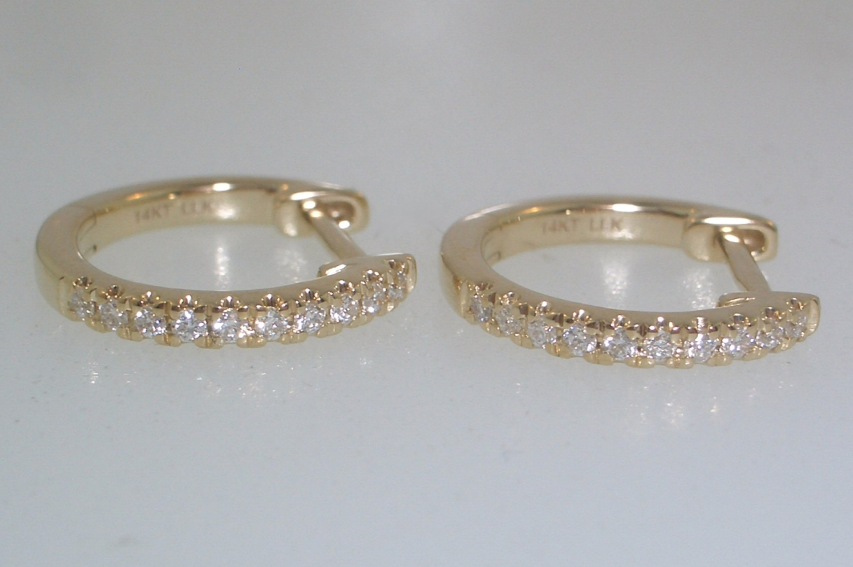 Ladies 14k yellow gold huggie style earrings set with (20) twenty round brilliant cut diamonds that weigh a total of .10 carats. Gold weight with diamonds is 1.53 grams.