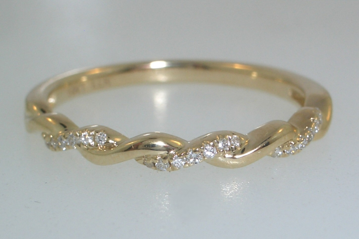 Ladies 14k yellow gold twist wedding band set with (21) twenty-one round brilliant cut diamonds that weigh a total of .06 carats. Gold weight with diamonds is 2 grams.
